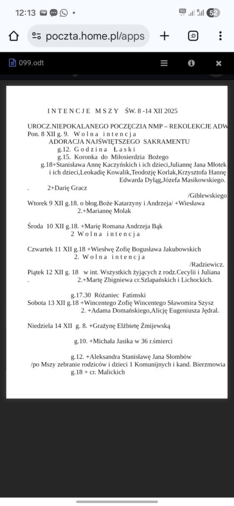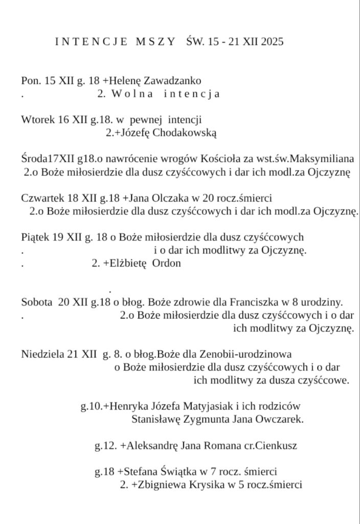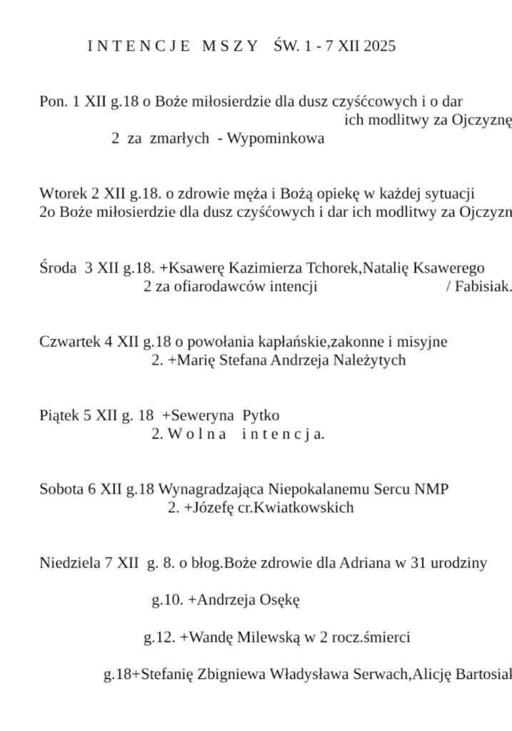 INTENCJE MSZY ŚW. (22–28 XII 2025)