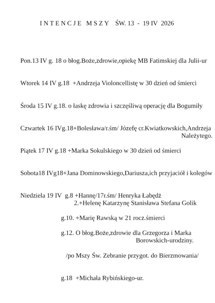 Intencje Mszy Świętych: 13-19 kwietnia 2026